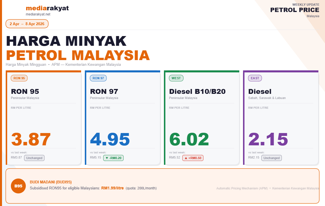 According to the Minister of Finance, the Government has set the retail price of RON95 petrol at RM3.87 per litre, RON97 petrol at RM4.95 per litre, and diesel (B10/B20) in Peninsular Malaysia at RM6.02 per litre for the period from 2 Apr to 8 Apr 2026.